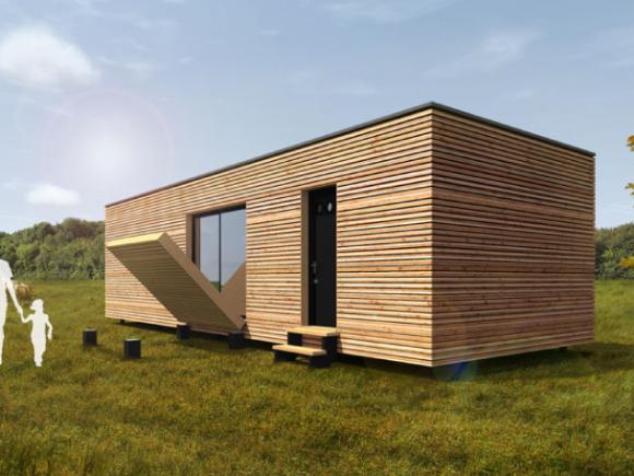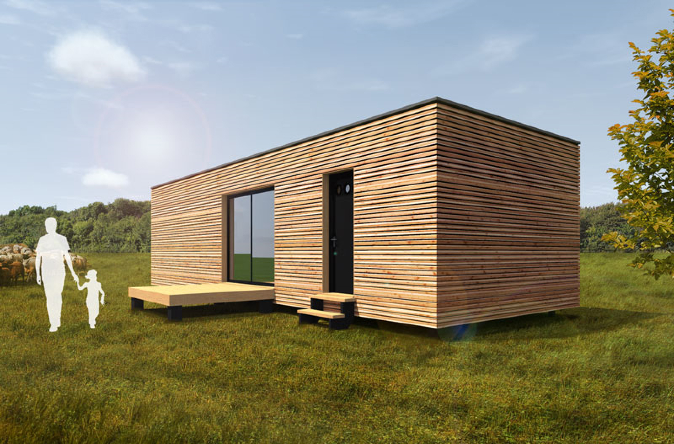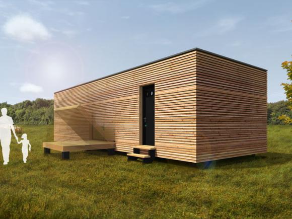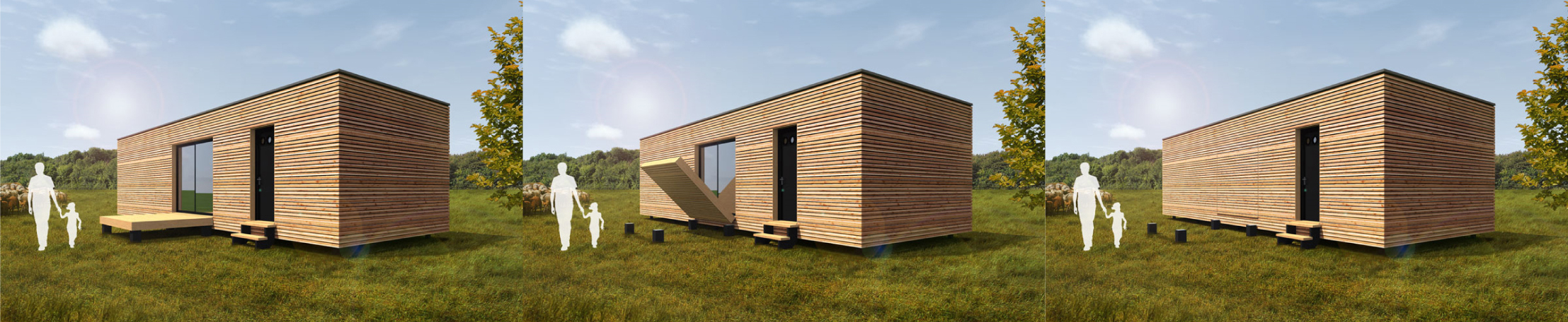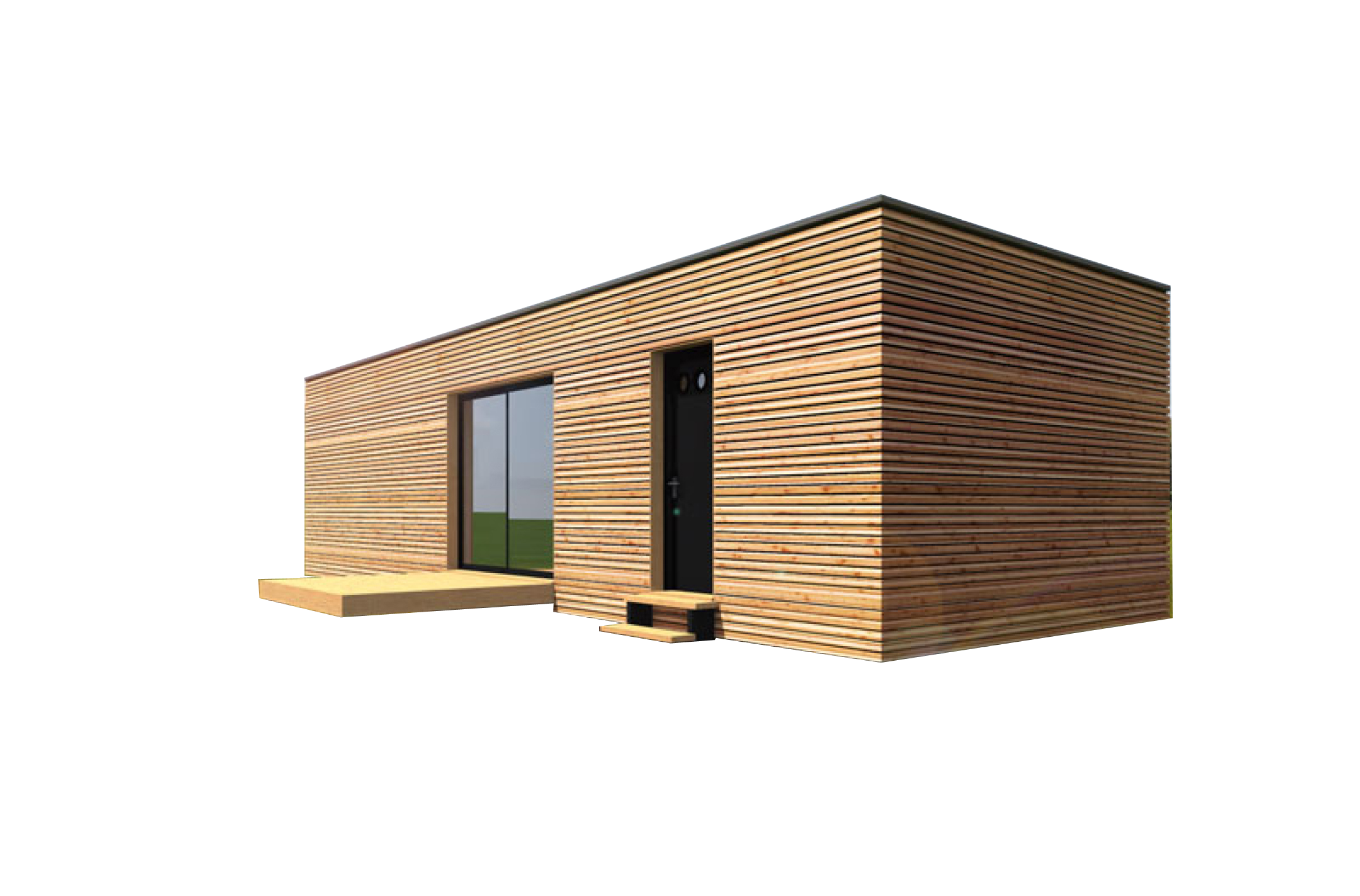 Das woodhouse mit der grossen Klappe. Dieses woodhouse hat einen eigenen Eingang mit Eingangsbereich. Das Hauptfenster lässt sich auf einfache Art mit der Terrasse schliessen. Das woodhouse kann voll ausgebaut nach Wunsch geliefert werden, oder im Rohbau mit oder ohne Bodenbelag und weissen Wänden.